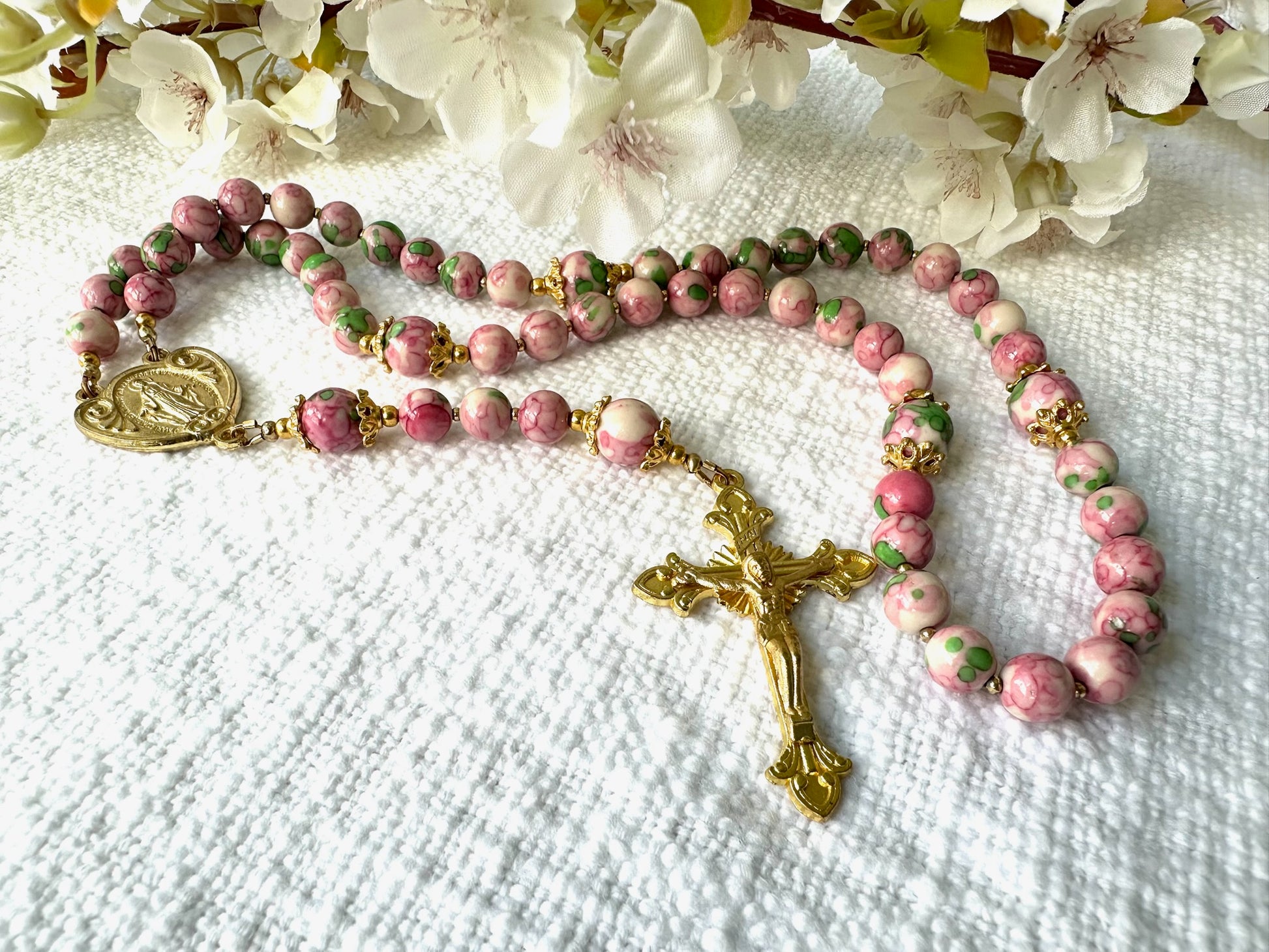 Rosary of Blooming Grace — Pink & Green Rainwater with Gold