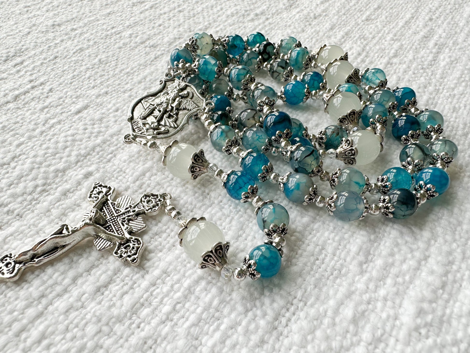 The Rosary of Divine Protection radiates courage and peace, inspired by the steadfast defense of Saint Michael the Archangel. Handcrafted with 8mm blue dragon vein agate beads—each one uniquely patterned in shades of deep ocean blue and silver-gray—and accented with luminous 10mm white moonstone beads, this rosary reflects strength rooted in faith.
