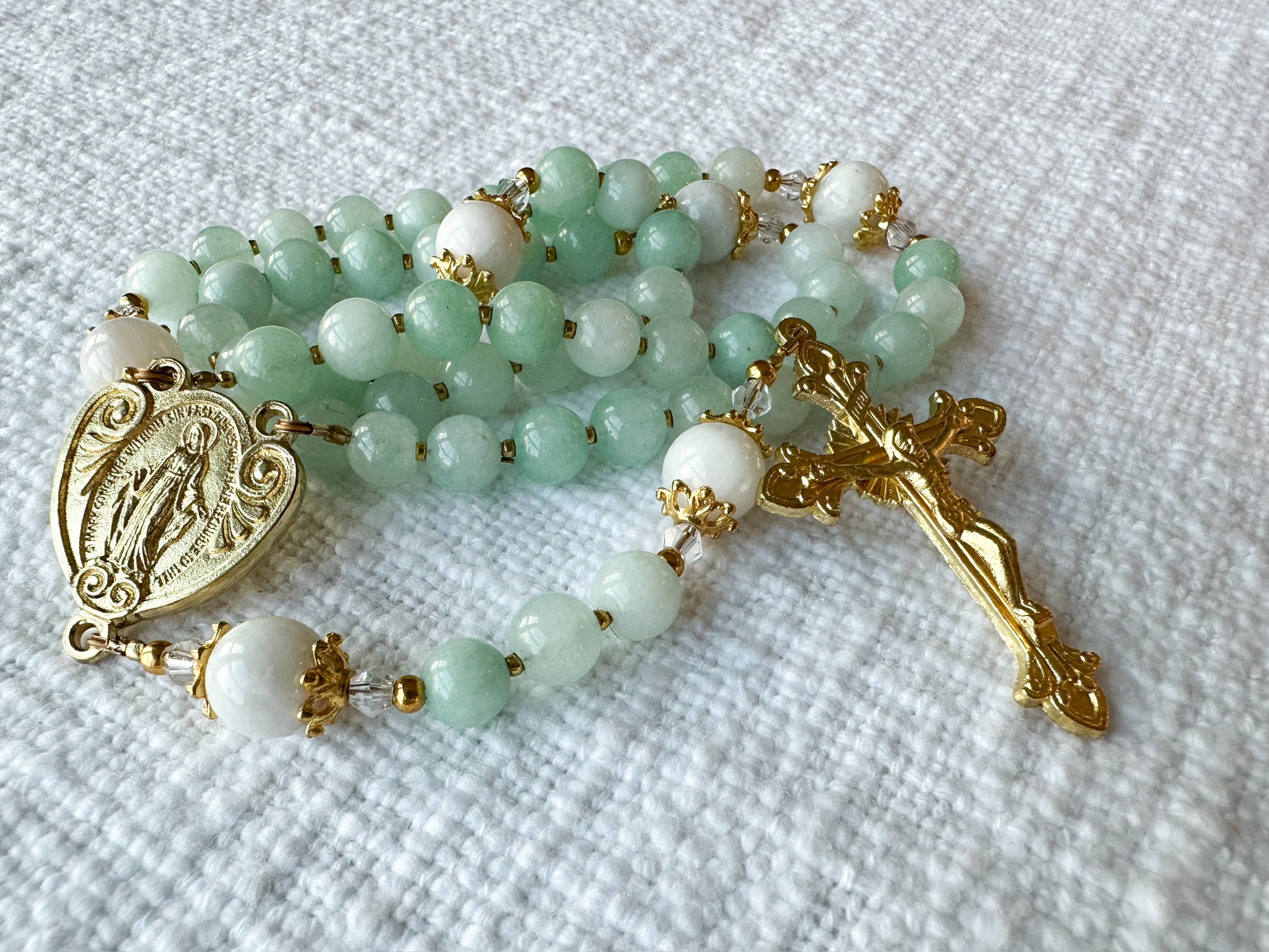 The Rosary of Heavenly Peace reflects the calm assurance of God’s presence. Soft hues of light green jade and milky moonstone meet in a graceful balance of serenity and light. Each bead glows gently, inviting the soul into quiet prayer and trust in divine providence.
